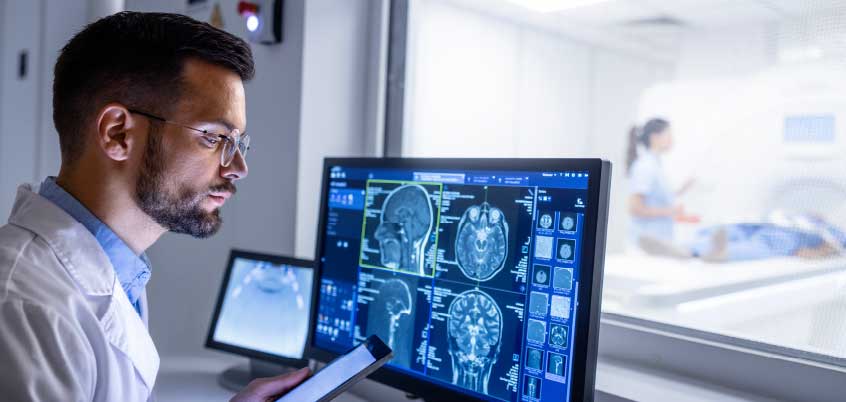 woman and two men looking at computer monitor